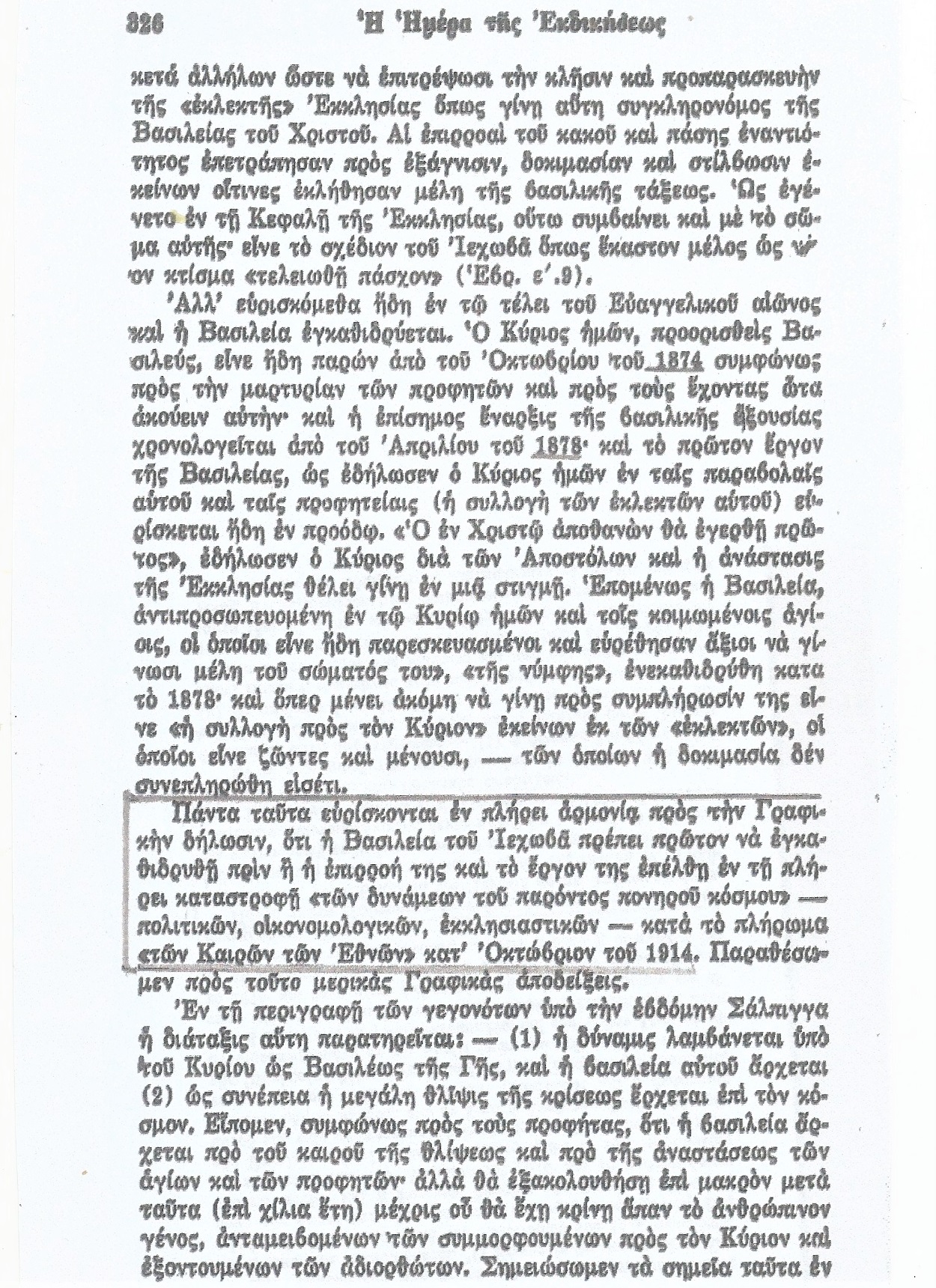 "Πάντα ταύτα ευρίσκονται εν πλήρει αρμονία πρός τήν Γραφικήν δήλωσιν, ότι η Βασιλεία του Ιεχωβά πρέπει πρώτον νά εγκαδρυθή πρίν ή η επιρροή της καί τό έργον της επέλθη εν τη πλήρει καταστροφή "των δυνάμεων του παρόντος πονηρού κόσμου" - πολιτικών, οικονομολογικών, εκκλησιαστικών - κατά τό πλήρωμα "των Καιρών των Εθνών κατ' Οκτώβριον του 1914". ( ΓΡΑΦΙΚΑΙ ΜΕΛΕΤΑΙ ΤΟΜΟΣ Δ. Η ΜΑΧΗ ΤΟΥ ΑΡΜΑΓΕΔΔΩΝΟΣ 1897-1923, σελ. 326. Η υπογράμμιση δική μας).